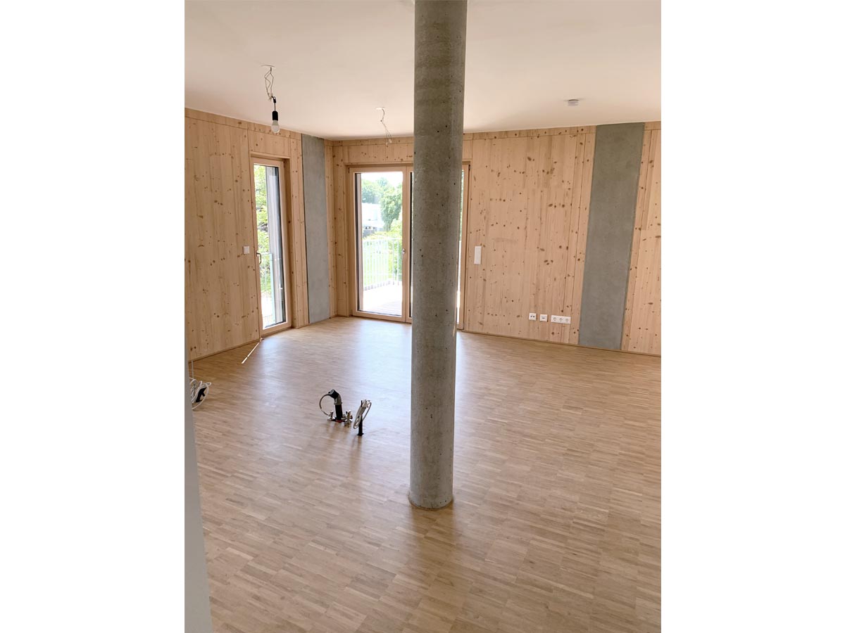 Unser 2. Bauabschnitt in Neu-Ulm steht kurz vor der Fertigstellung. Er ergänzt das Ensemble mit 15 freifinanzierten Wohnungen, alle mehrfachorientiert und in Holzbetonbhybridbauweise errichtet.