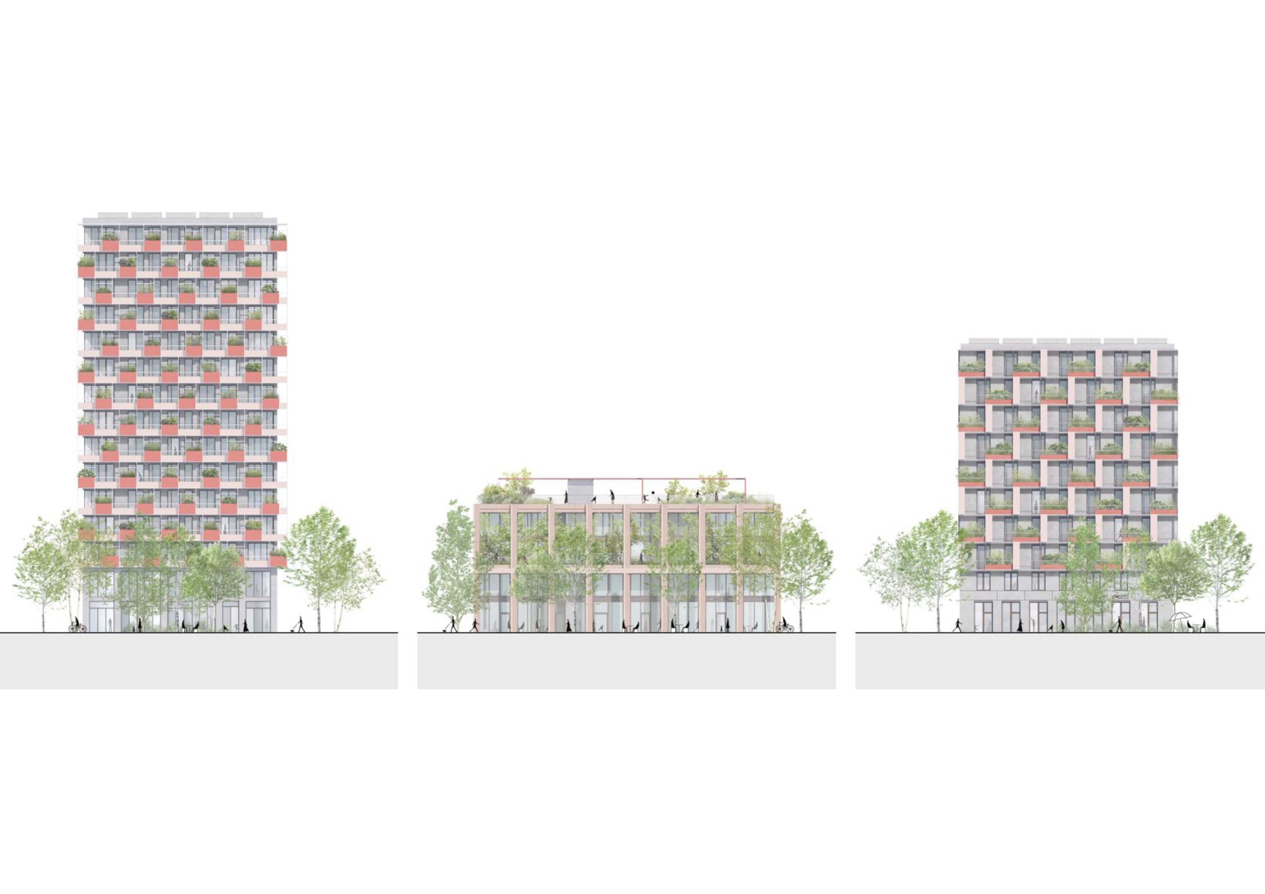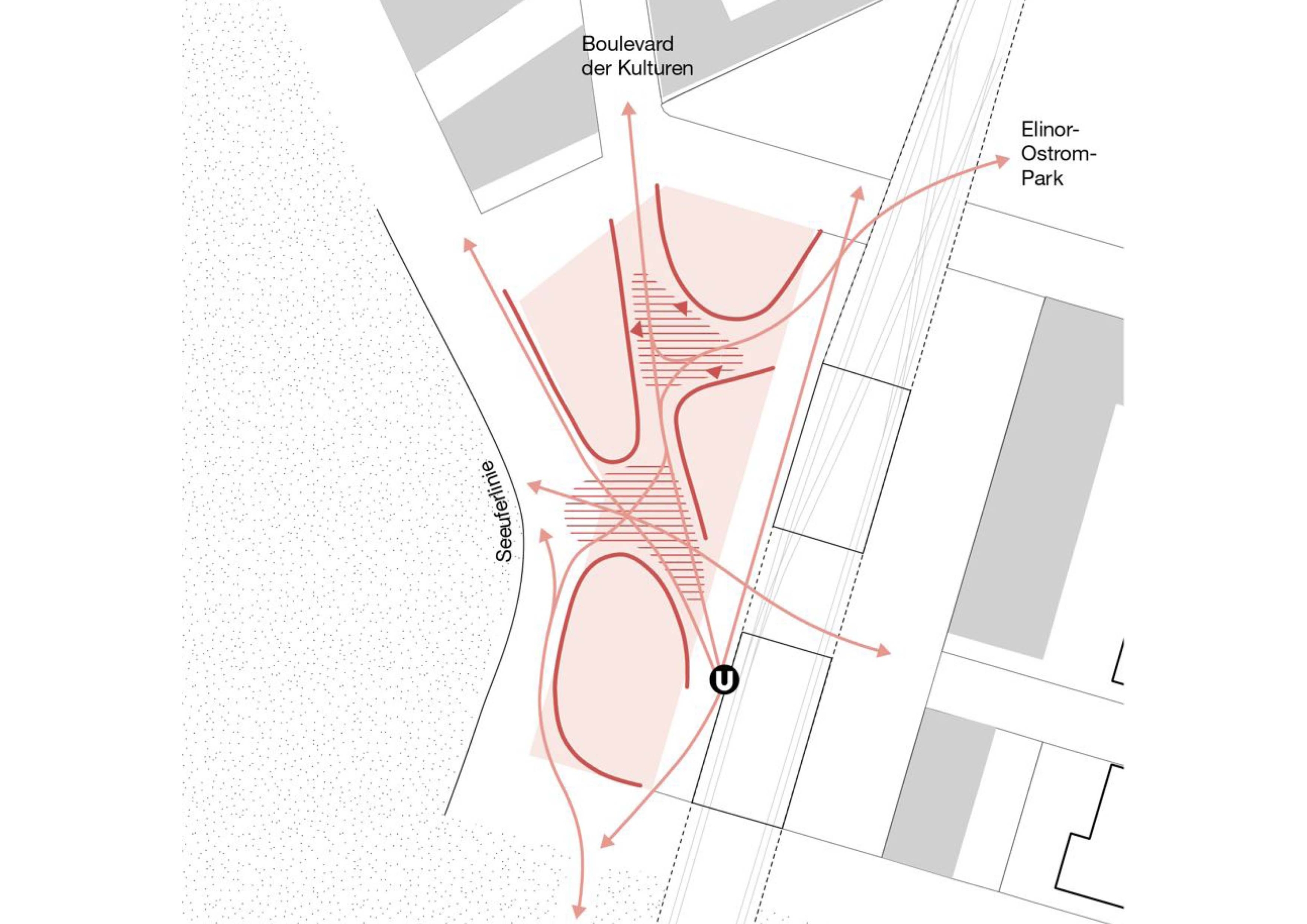 Hier zieht sich der Raum zwischen Seeufer und U-Bahn zu einem südlichen Pol zusammen, der seine mehrfache Entreefunktion orchestriert: an der Tür der U-Bahn-Station wird man mit 4 Perspektiven begrüßt: die Silhouette des Seeparkquartiers, die Arkaden der Seeterrassen, die Platzfolge zum Boulevard der ­Kulturen und der Korridor zum Elinor-Ostrom-Park. Einen signifikanten ­Auftakt erlebt man vom Seeparkquartier kommend durch die schmale Stirnfront des Hochhauses, dessen Zuschnitt die Ströme ans Seeufer lenkt. Kommt man von den Seeterrassen oder vom Boulevard der Kulturen, wird man vom Schwellenplatz empfangen, Transitorium und Ort zugleich. Vom Elinor-Ostrom-Park kommend lädt eine ­verschwenkte Front zum ­Besuch des Binnenplatzes ein, der über den Schwellenplatz zum Seeufer oder zur U-Bahn leitet.