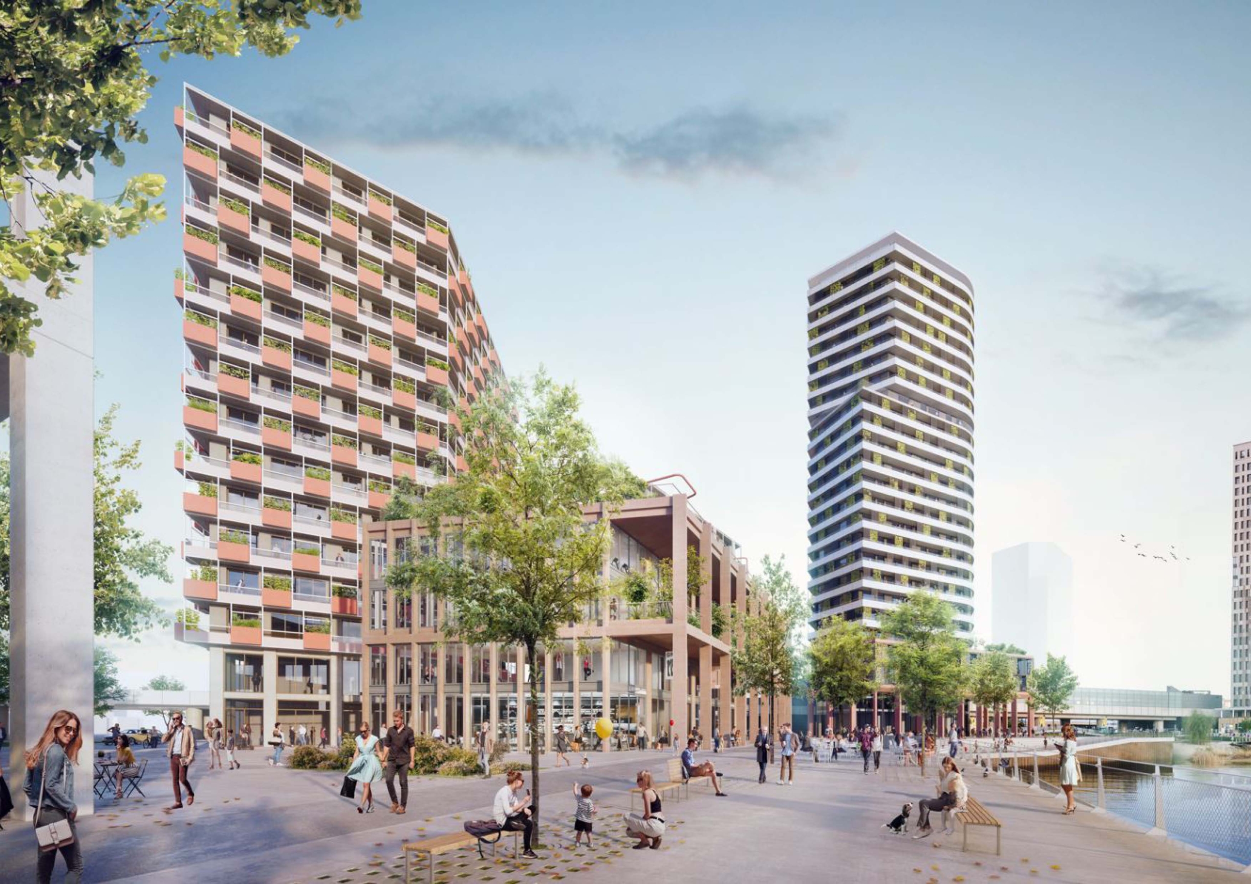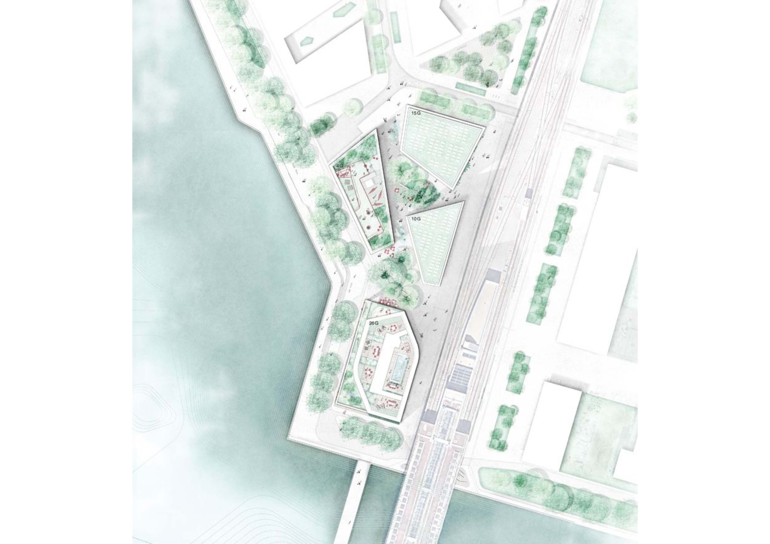 Die drei Baukörper stehen als lockerer Cluster rund um den zentralen Platz. Der Solitär bildet den markanten Abschluss der Uferkante.