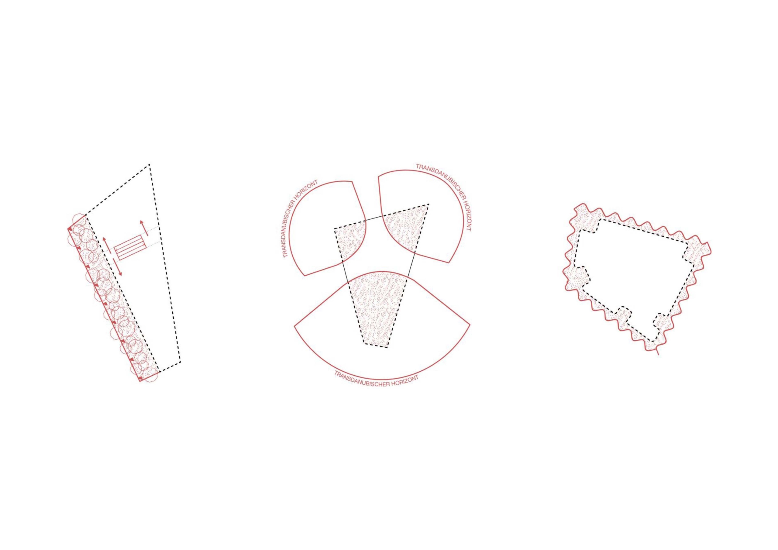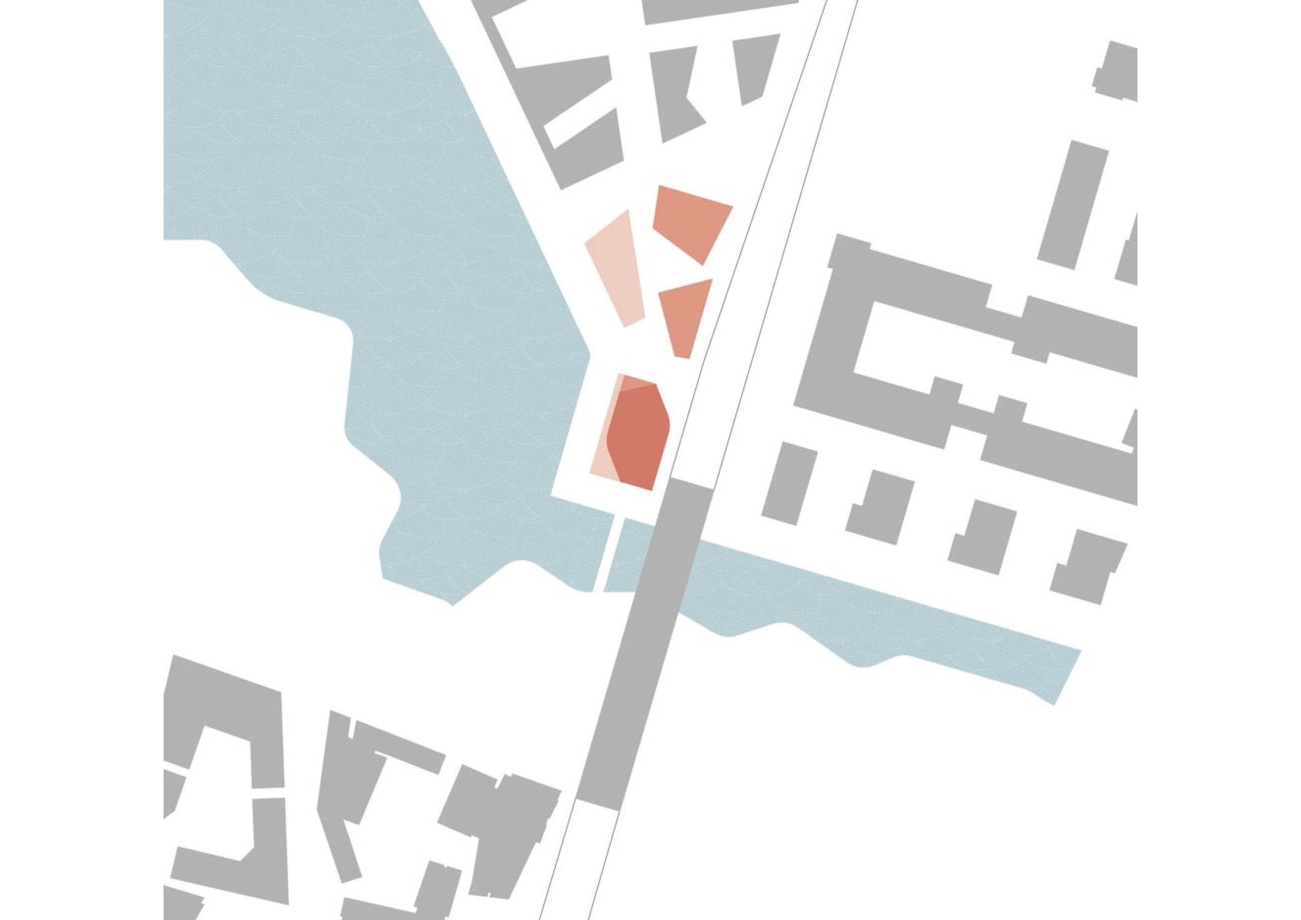 Eine Platz­folge aus Schwellen- und Binnenplatz schafft adressbildende Freiräume, die gleichzeitig einladende Übergänge zwischen Seeufer und U-Bahn­korridor ausbilden. Der Binnenplatz fungiert als geschützte und ­zugleich durch­lässige Quartiersmitte, an der die Hauseingänge zu den drei ihn rahmenden Schollen verortet sind. Hingegen wird der Schwellen­platz durch das Kürzen der westlichen, sowie das ­„Hereinrutschen“ der östlichen Scholle (Front am See) als charaktervoller Übergangsraum mit einem starken Bezug zum Seeufer erlebbar.