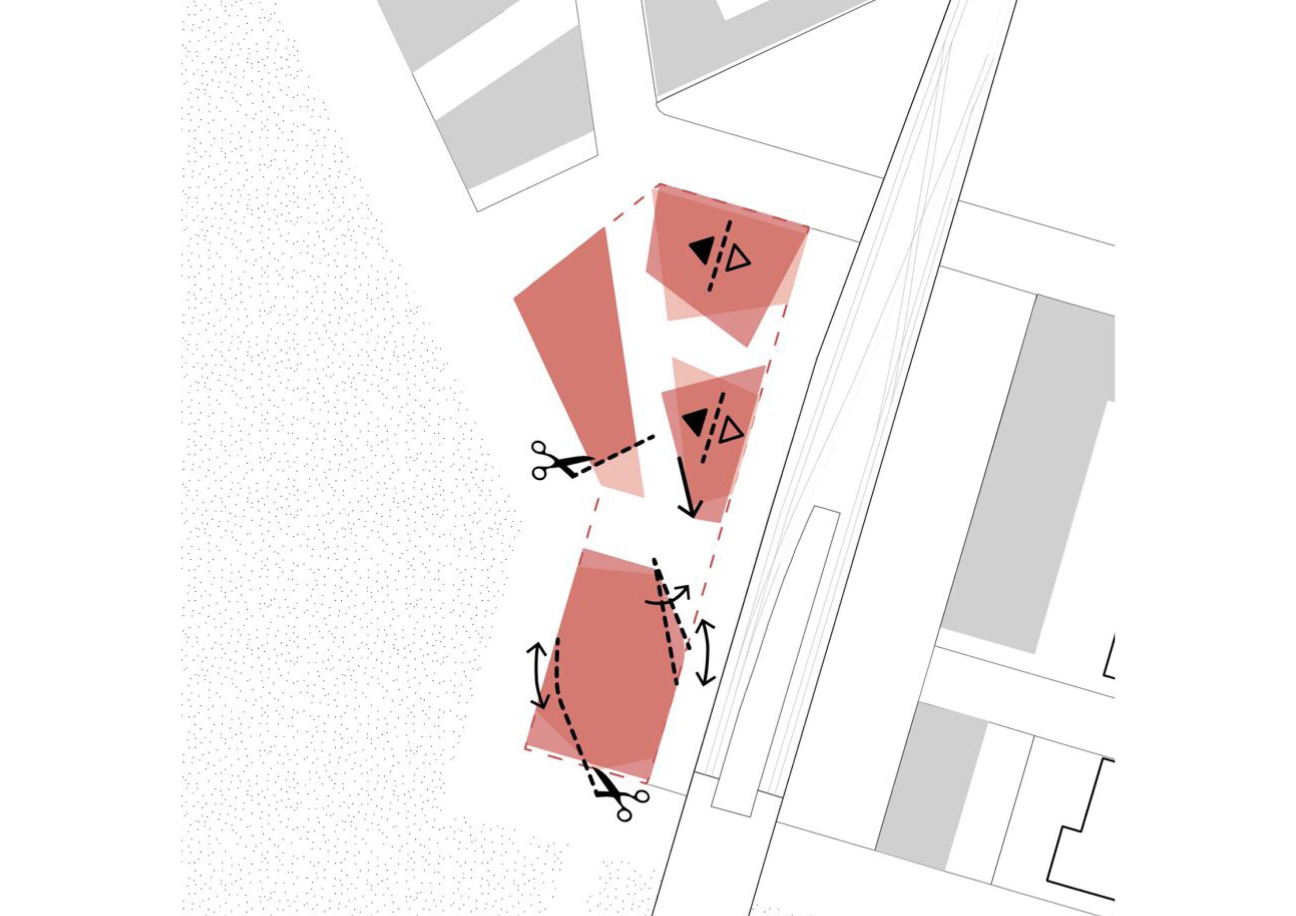 Durch Schneiden, Spiegeln, Schwenken und Schleifen konkretisieren sich die Umrisse des Leitbilds zu einer gleichzeitig großzügigen und kompakten städtischen Figur. Die raumbildende 3+1-Konfiguration des Leitbilds – Schollentrio und kontextueller Solitär – wird beibehalten – ein Plädoyer für die Kleinkörnigkeit als Alleinstellungsmerkmal des Schollenquartiers und ­seiner öffentlichen Räume. Allerdings sorgt ein veränderter Zuschnitt der Häuser für neue Qualitäten im öffentlichen Raum.