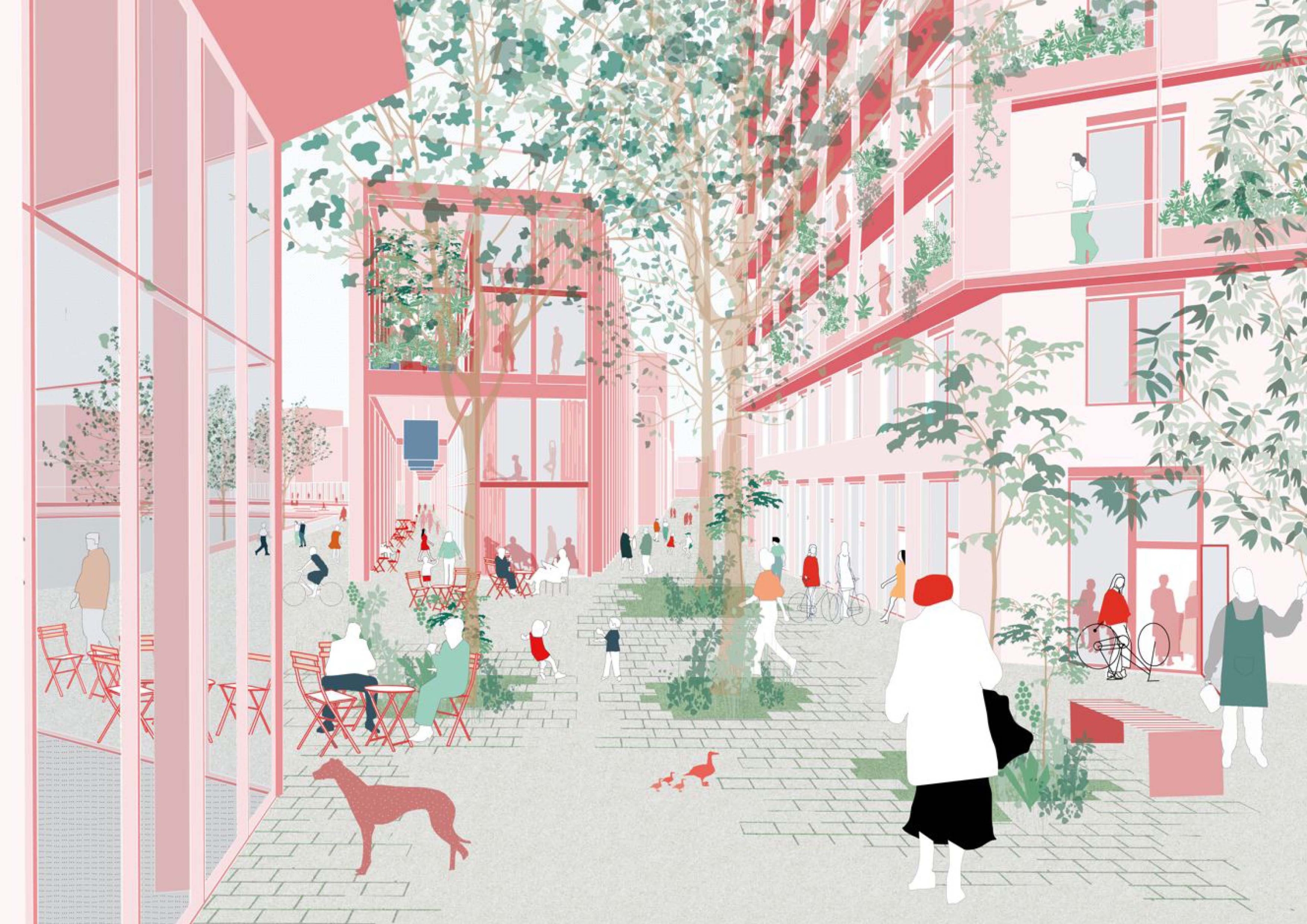 Die raumbildende 3+1-Konfiguration des Leitbilds – Schollentrio und kontextueller Solitär – wird beibehalten – ein Plädoyer für die Kleinkörnigkeit als Alleinstellungsmerkmal des Schollenquartiers und seiner öffentlichen Räume.