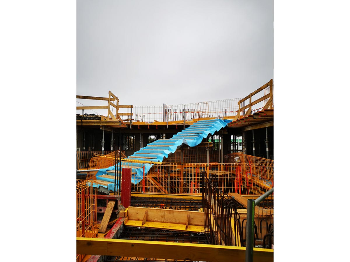 Die erste Stiege ins Pawlatschenatrium ist eingesetzt und in einen Regenmantel gehüllt: die Baustelle von Parcours wächst langsam in die Höhe.