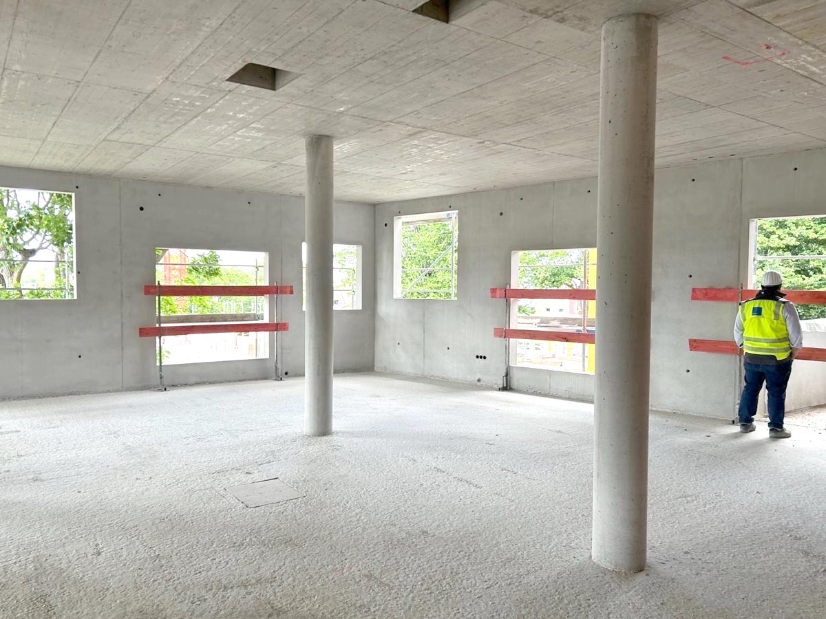 Der Rohbau vom Haus Diana, ‚Quartier am Rotweg‘ Stuttgart befindet sich kurz vor Fertigstellung. Im Bild die zweigeschoßige Kindertagesstätte im Sockelbereich mit großzügigen Stützweiten – darüber wächst das Haus in Holz-Beton-Hybridbauweise weiter.