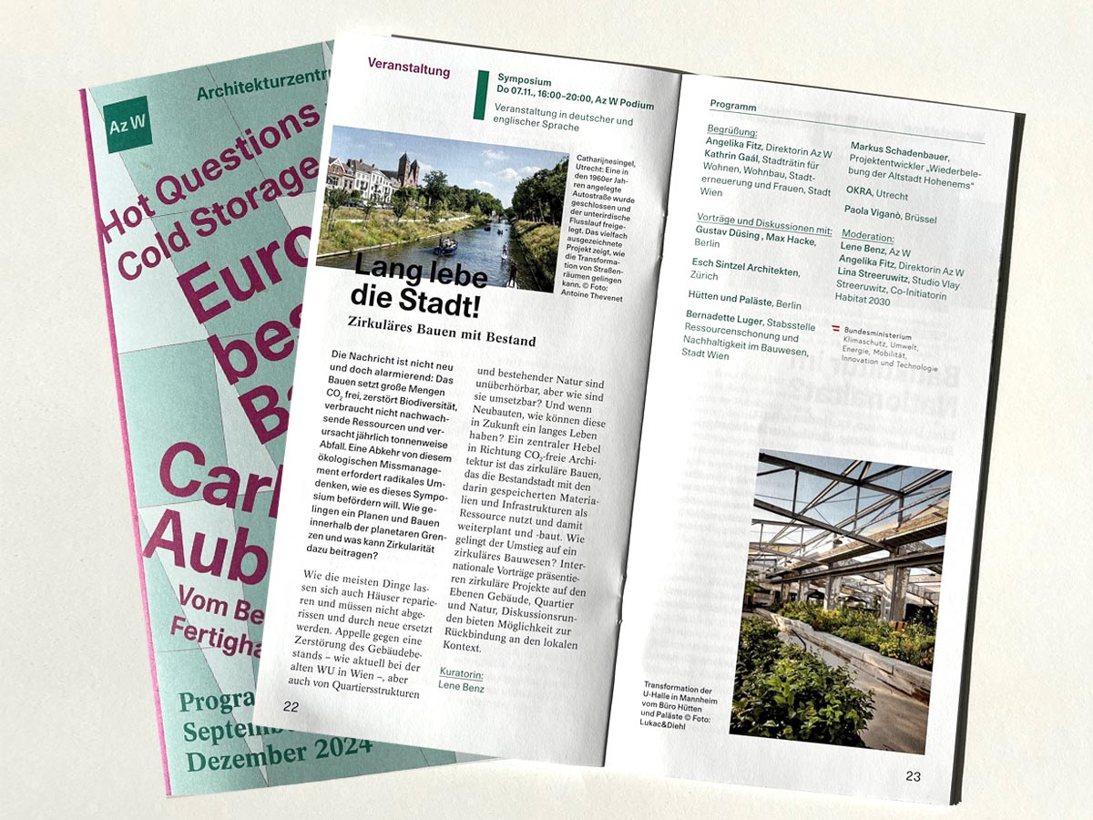 Am 7.11. führt Lina Streeruwitz im Rahmen des Symposiums „Lang lebe die Stadt“, organisiert vom Architekturzentrum Wien, ein Gespräch zur Langlebigkeit von Gebäuden mit Stephan Sintzel, Max Hacke und Gustav Düsing.